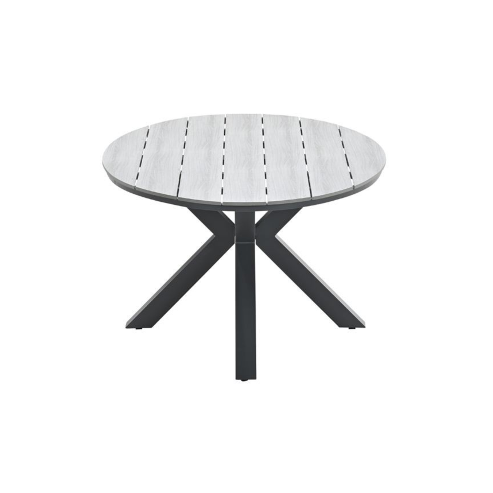 Het stevige frame is vervaardigd uit aluminium en afgewerkt met een donkergrijze poedercoating. Dit maakt de tuintafel weerbestendig en onderhoudsarm. Het grijze tafelblad is gemaakt van Vironwood – een kunststof met een realistische houtstructuur die lijkt op grey teak. Je geniet van de luxe uitstraling van hout, zonder het gedoe van schuren, oliën of lakken.