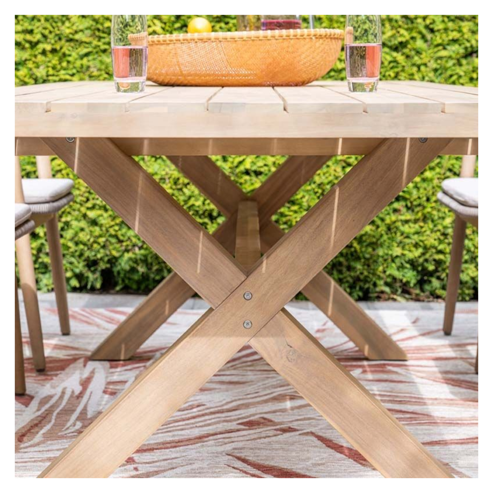 Design tuintafel met rond Centostone blad en houten onderstel in kruisvorm