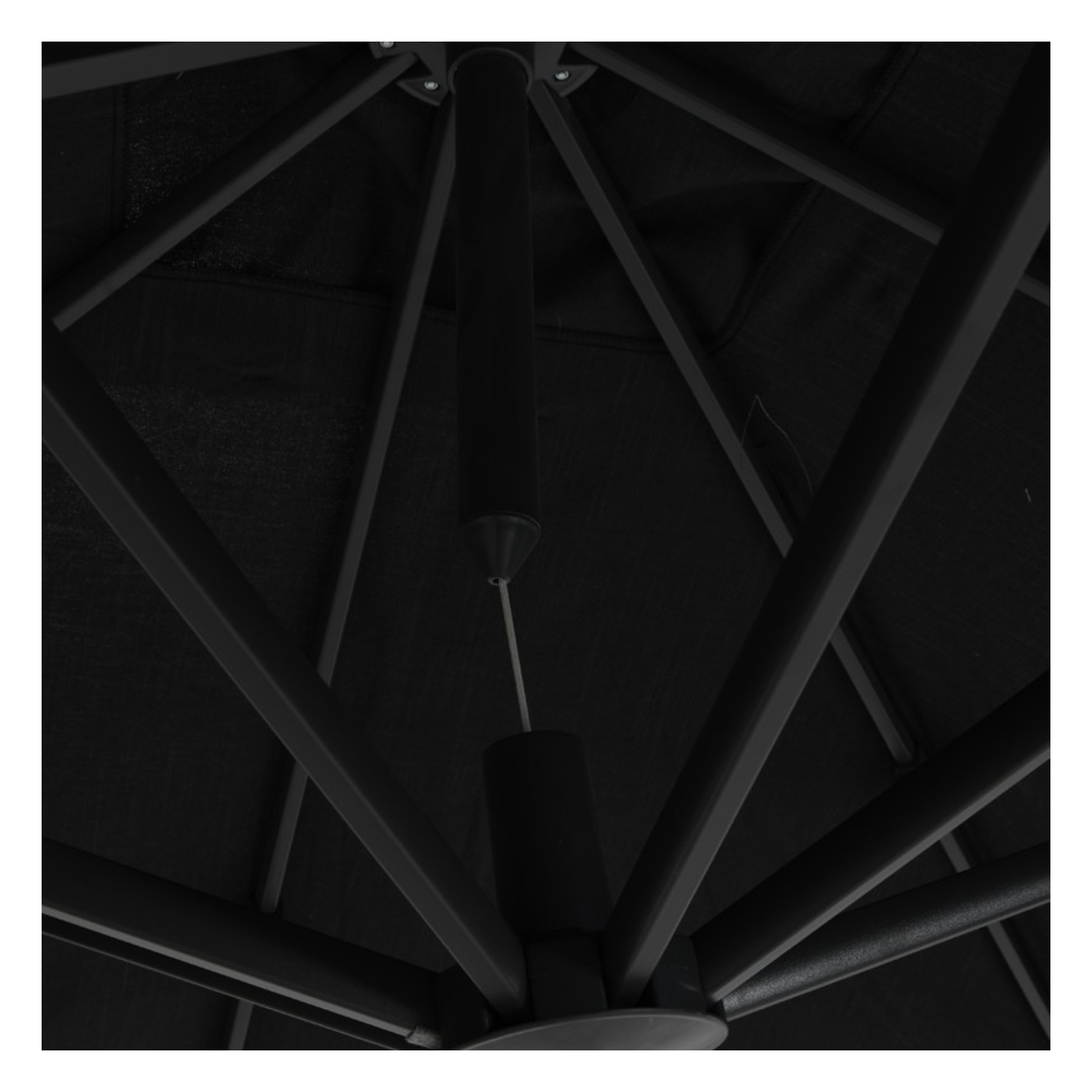 Het frame van gepoedercoat aluminium in matzwart is stevig, roestbestendig en onderhoudsarm. Het 250 g/m² dikke parasoldoek is gemaakt van duurzaam solution dyed polyester, dat uitzonderlijke bescherming biedt tegen uv-straling, verkleuring en vlekken. Een geïntegreerde windvanger bovenin het doek zorgt voor extra stabiliteit tijdens winderige dagen.