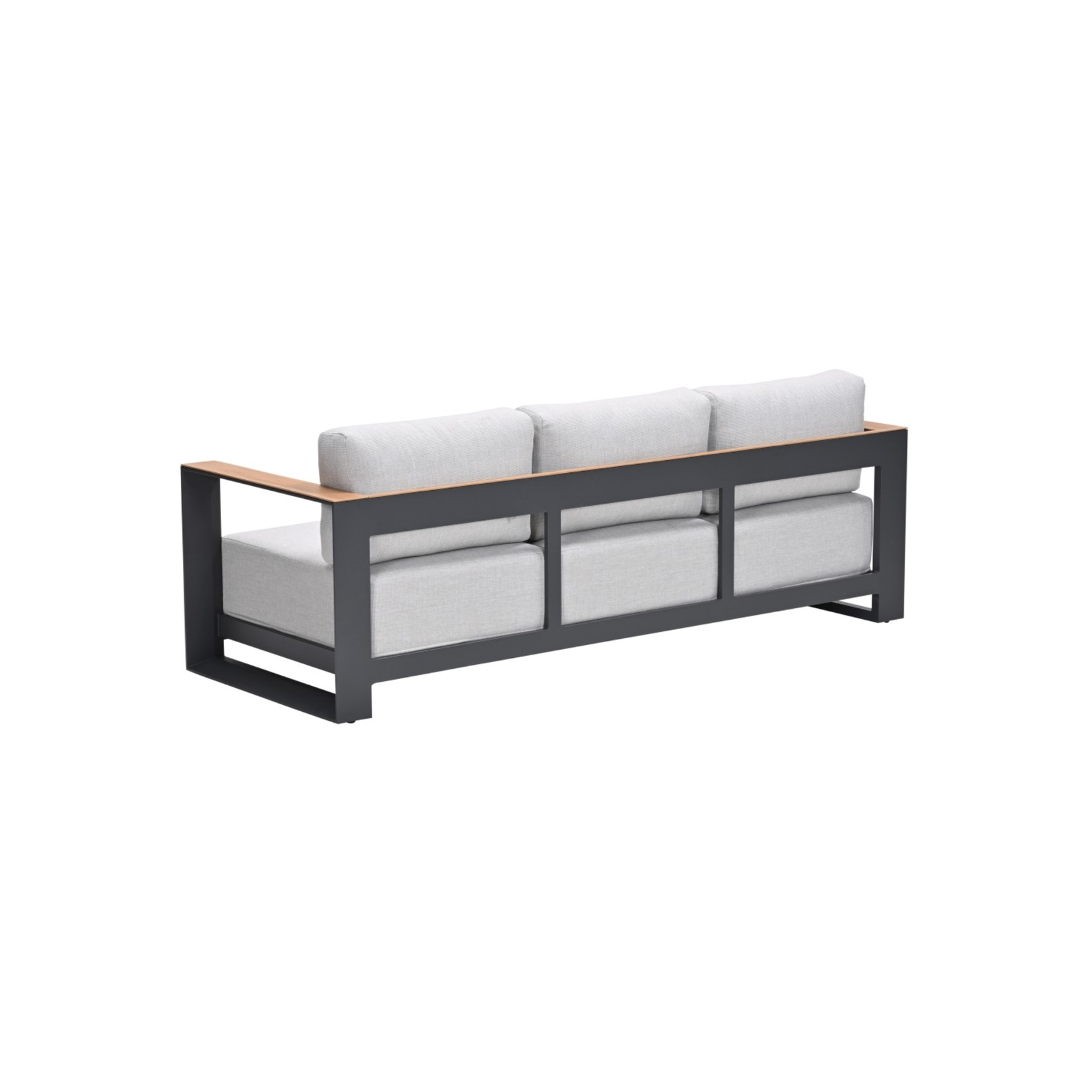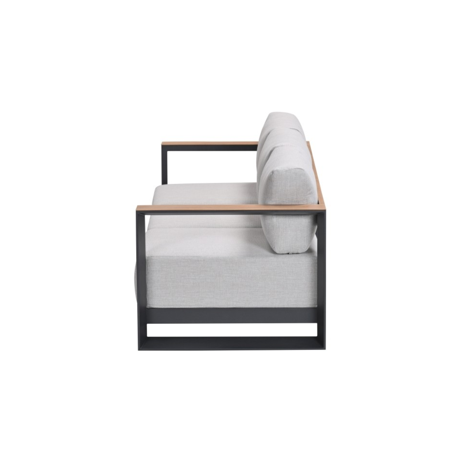De loungebank is vervaardigd uit hoogwaardig aluminium en afgewerkt met een beschermende poedercoating in carbon black. De rug- en armleuningen zijn voorzien van een handmatig aangebrachte light teaklook print, waardoor je het warme effect van hout krijgt zonder het onderhoud ervan. De zandkleurige kussens zijn royaal gevuld en bekleed met waterafstotende polyester hoezen – perfect bestand tegen wisselende weersomstandigheden.