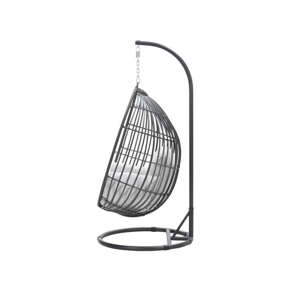 Panama eivormige hangstoel van rotan met standaard en grijze kussens, schuin van voren