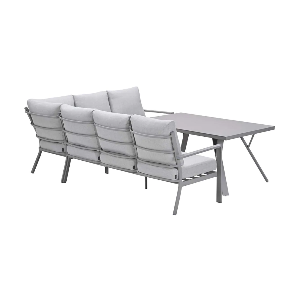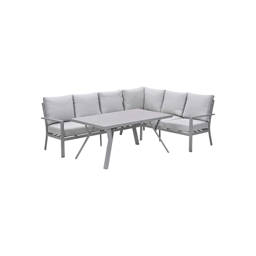 Ervaar comfort en stijl met de Sergio lounge dining set 3-delig rechts – valley sand van Garden Impressions. Deze luxe dining loungeset van aluminium met zandkleurige kussens biedt ruimte voor 6 personen en maakt elk tuinmoment bijzonder.
