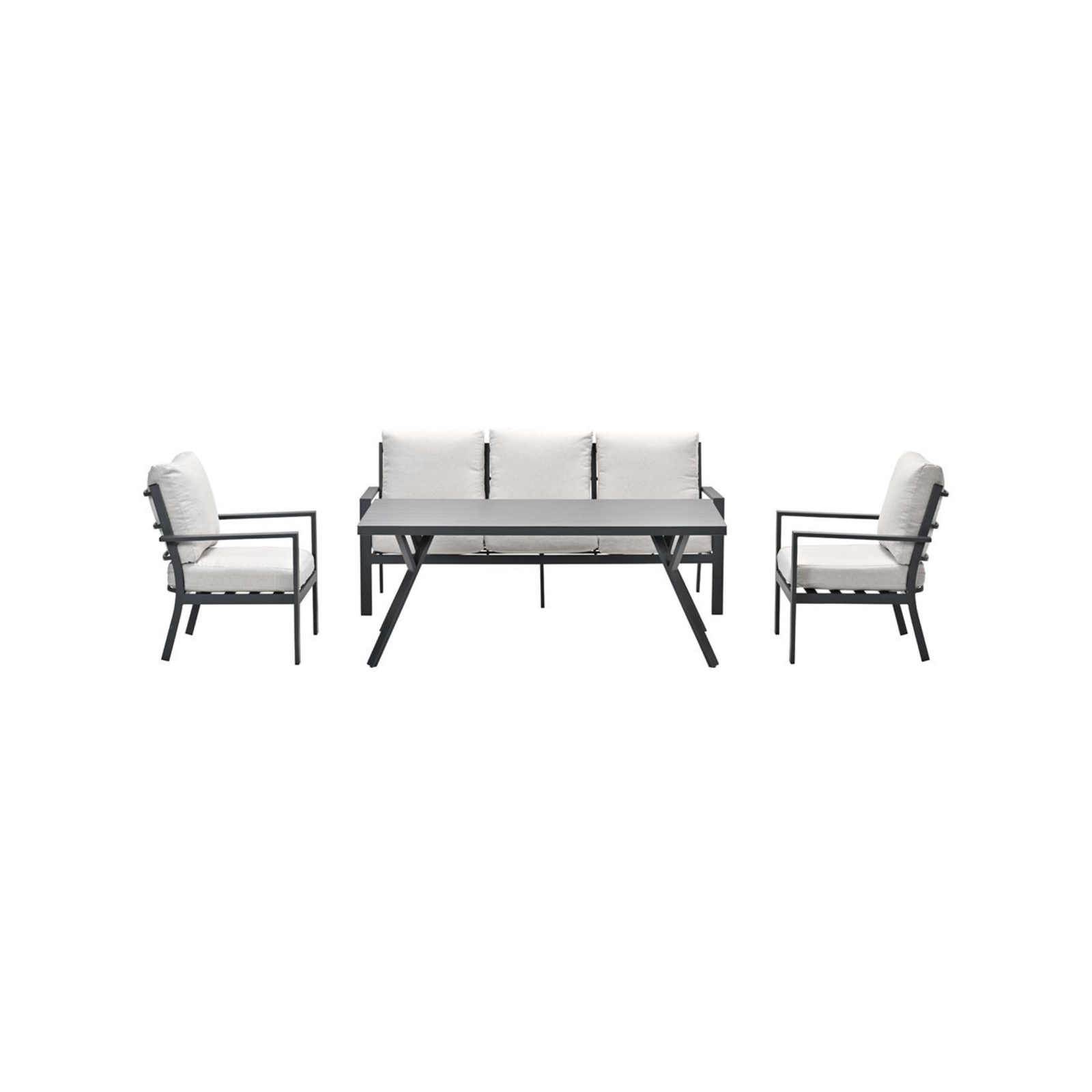 Til je tuinbeleving naar een hoger niveau met de Sergio lounge-dining sofa set – 4-delig – carbon black – desert sand. Deze complete lounge dining set combineert het comfort van een loungeset met het gebruiksgemak van een eettafel. De set bestaat uit een ruime driezitsbank, twee stijlvolle fauteuils en een hoge aluminium tafel – perfect om te genieten van lange zomerdagen, of je nu wilt ontspannen of uitgebreid wilt dineren.