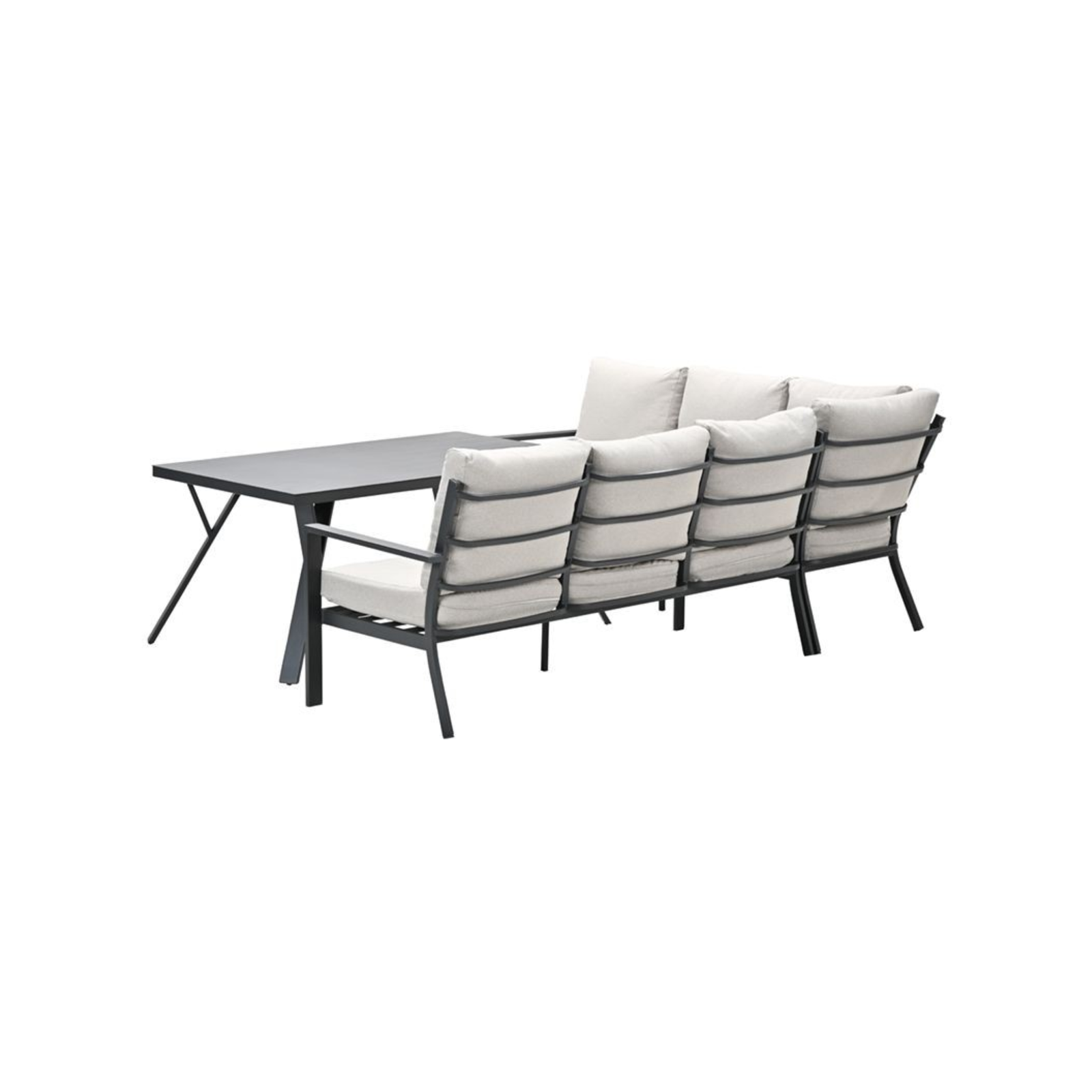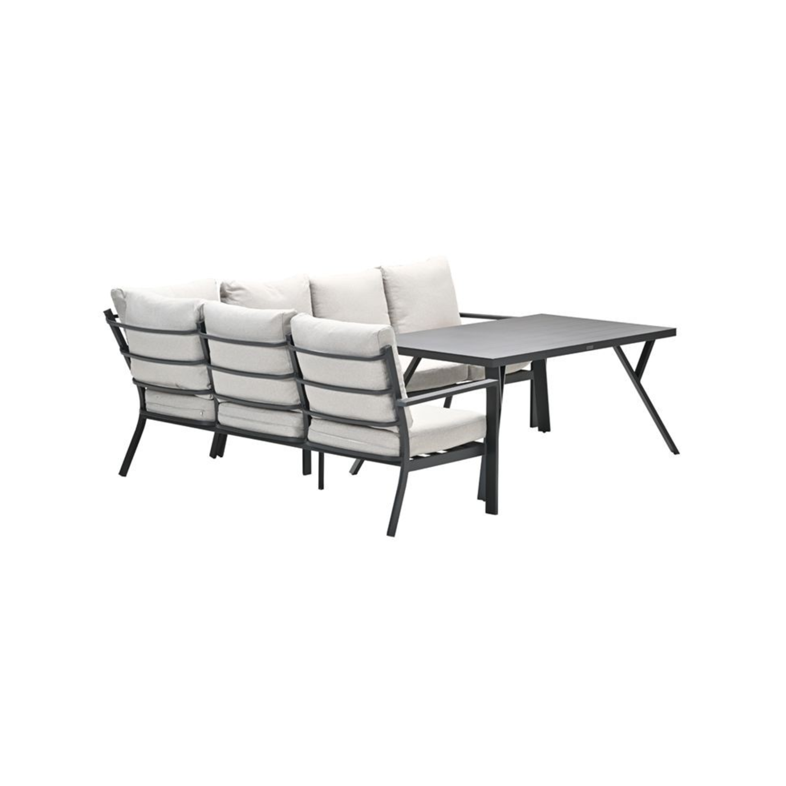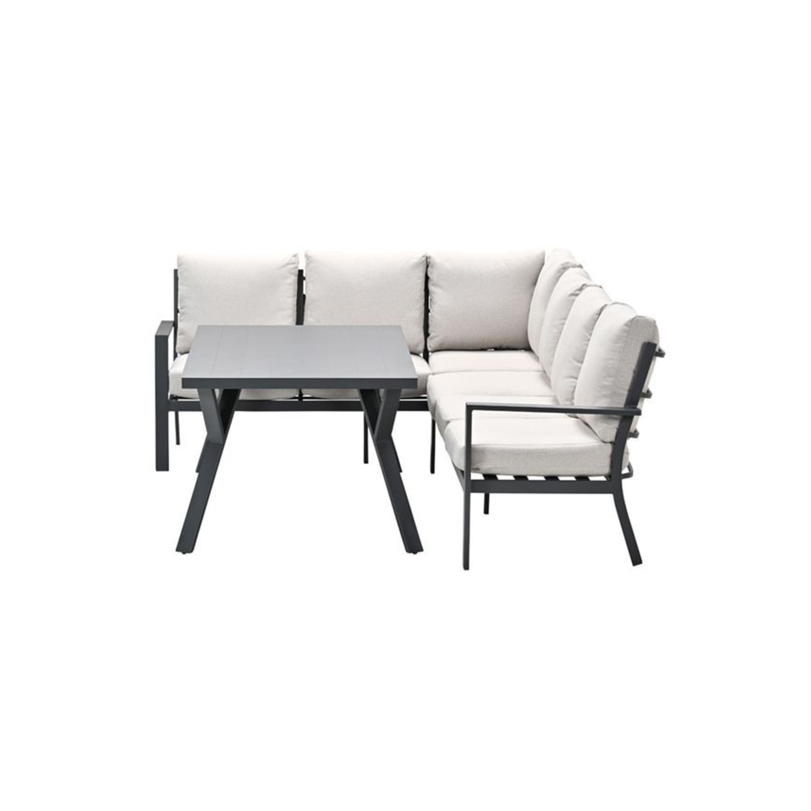 Deze lounge diningset is vervaardigd uit weerbestendig aluminium in de kleur carbon black en is voorzien van zandkleurige polyester kussens met een waterafstotende coating. De set bestaat uit een royale hoekbank en een ruime aluminium tafel met een blad van 150 x 90 cm, afgewerkt in dezelfde hoogwaardige stijl. Dankzij de zithoogte van 42 cm en de rughoogte van 85 cm biedt deze set extra ondersteuning en comfort voor een ontspannen houding.