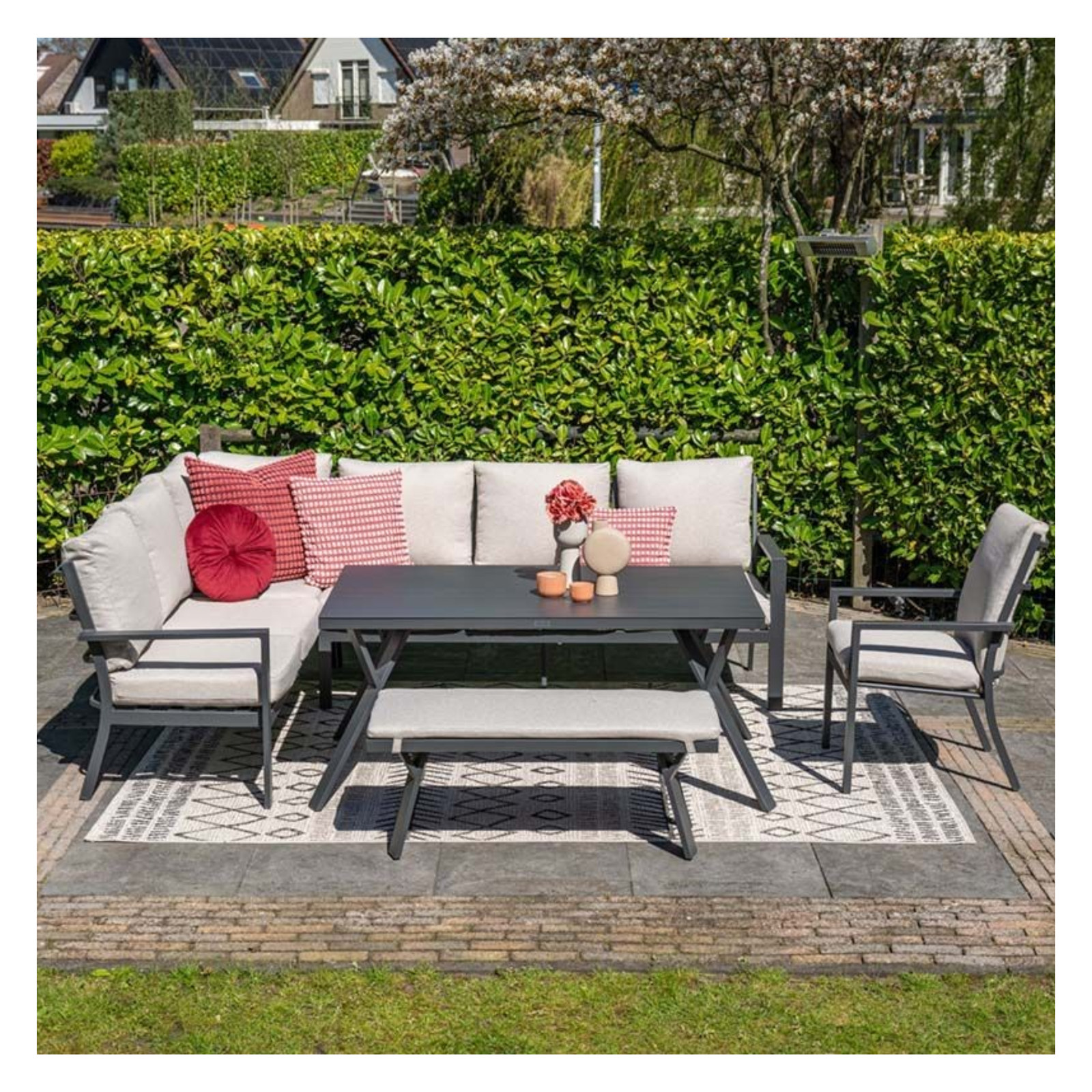 Houd je lounge diningset in topconditie door regelmatig onderhoud. Reinig het aluminium frame met een mild schoonmaakmiddel en gebruik een textielprotector om de kussens extra te beschermen tegen vuil en vocht. Berg de kussens op een droge plek op wanneer je ze langere tijd niet gebruikt.