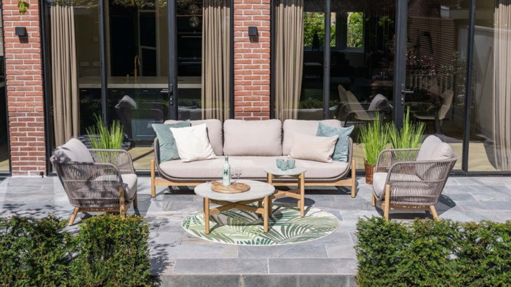 Zachte loungekussens, buitenkleden, verlichting, bijzettafels en zelfs buitenhaarden zijn geen luxe meer, maar een standaard onderdeel van de buiteninrichting. Mensen willen het hele seizoen comfortabel buiten zitten, en dat vraagt om meer dan alleen een tuinstoel en parasol.
