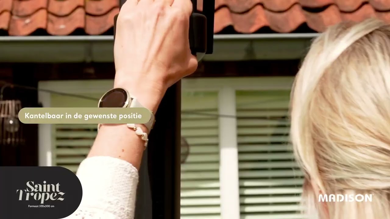 De Madison Syros luxe parasol 280×280 cm: hoogwaardig doek, aluminium frame en eenvoudige bediening. Bekijk het product van dichtbij in deze video.